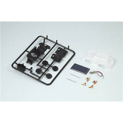 包装形態:ヘッダー付化粧箱入 重量:123g セット内容:シャーシ×1 後輪取り付け部品×1 ピニオンギヤ×1 太陽電池取り付け板×1 ギヤ付タイヤ×1 タイヤ×3 透明カバー×1 太陽電池×1 車軸×2 マイクロモーター×1 金具A×2 金具B×2 解説書×1 自分で作る楽しい科学グッズ フルカラー解説教本
