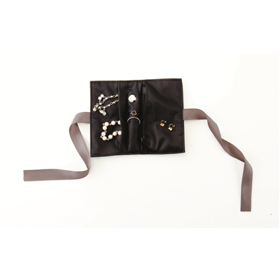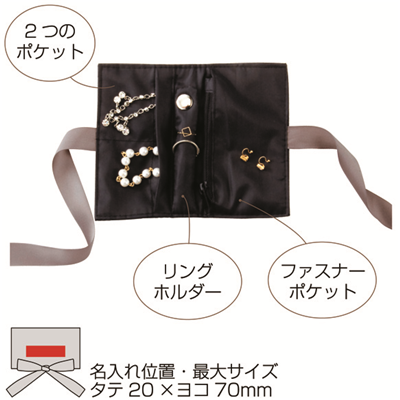 シャイニーリボンがアクセントになった、機能性に富んだジュエリーポーチです。
